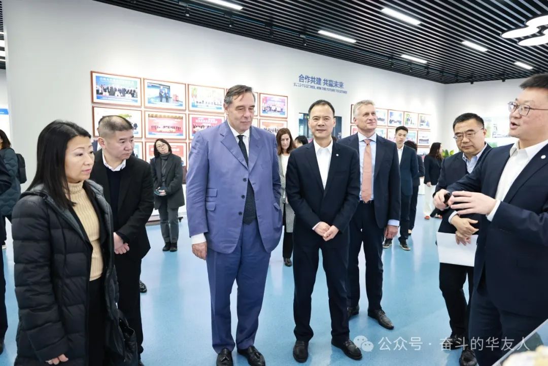双方围绕新能源汽车电池产业链发展深入交流。陈红良总裁代表公司介绍了打造开放华友、绿色华友、科技华友的战略和布局。座谈交流前,陈总陪同普利蒂副总裁一行参观了总部展厅,对公司的发展历程、产业布局、产品应用、项目建设、战略规划等进行了介绍。