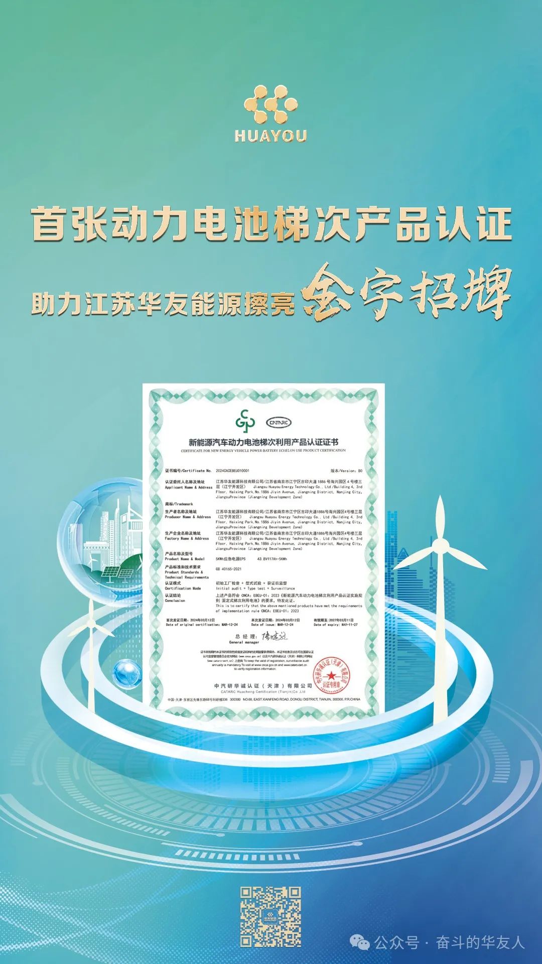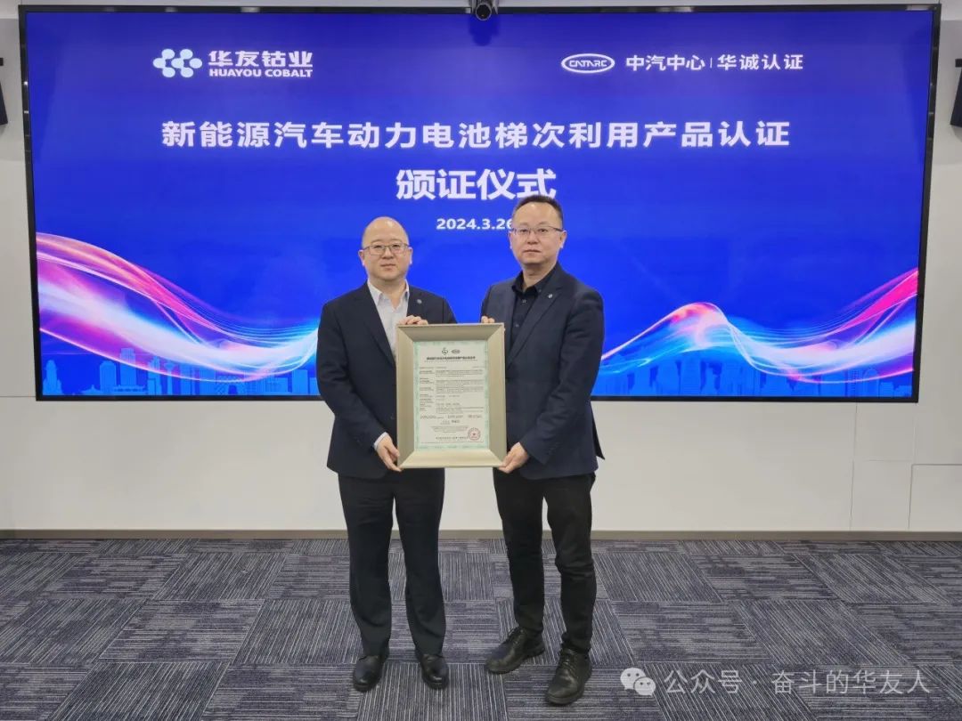 3月26日,新能源汽车动力电池梯次利用产品认证颁证仪式在天津举行。江苏华友能源科技有限公司(以下简称“江苏华友能源”)荣获国内首张新能源汽车动力电池梯次利用产品认证证书,标志着我国新能源汽车动力电池梯次利用产品认证制度正式落地实施,充分彰显了质量认证保障产品质量安全、服务经济社会发展的积极作用。此次,通过认证的是5KWh应急电源EPS(43.8V117Ah-5KWh),标志着江苏华友能源梯次利用产品的安全性、可靠性在生产端、使用端均符合认证标准。