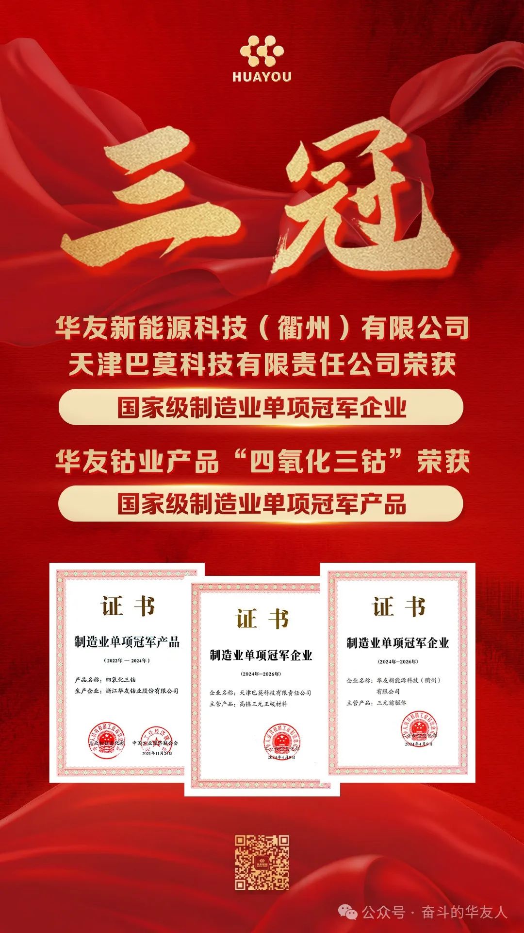 近日,华友钴业旗下公司华友新能源科技(衢州)有限公司、天津巴莫科技有限责任公司双双获得工信部正式颁发的“制造业单项冠军企业”证书。此前,华友钴业的“四氧化三钴”已摘得“制造业单项冠军产品”桂冠。