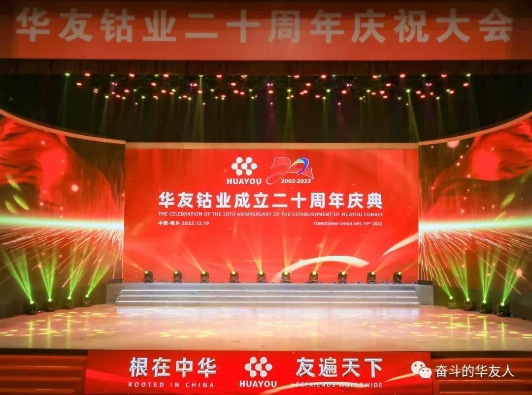 庆祝大会上,先后进行了二十周年纪录片——《奋进的华友》首映式;对华友二十周年劳动模范、二十周年杰出奋斗者、二十周年科技创新带头人、二十周年科技领军人才、二十周年突出贡献者、二十周年功勋人物获得者进行了隆重表彰;对精诚合作伙伴、卓越战略伙伴、功勋伙伴进行了授牌;同时还举行了华友慈善共富专项基金捐赠仪式,在华友成立二十周年之际捐赠五千万元用于美丽桐乡建设。