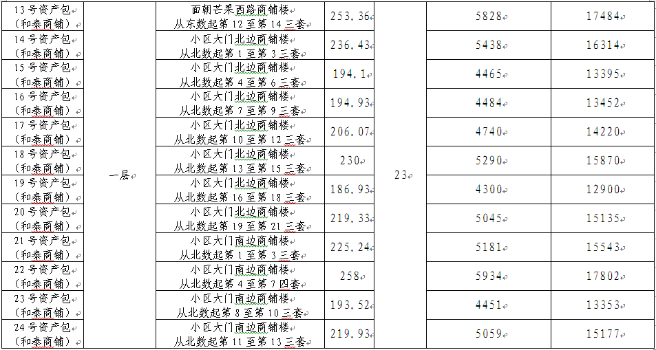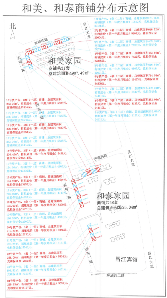 1、位于和美家园的全部商铺(3栋二层、共31套),和泰家园的全部商铺(3栋一层、共48套)。(按图)分成24宗资产包,各为一个标的。