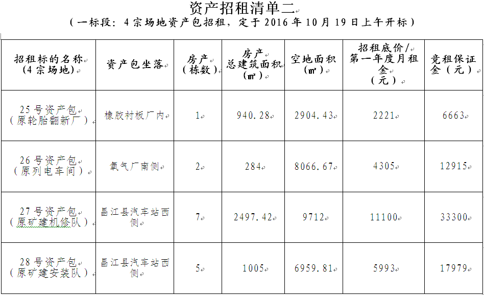 2、位于橡胶衬板厂内1宗、原列电车间1宗、昌江县汽车站西侧2宗。4宗场地资产包各为一个标的。
