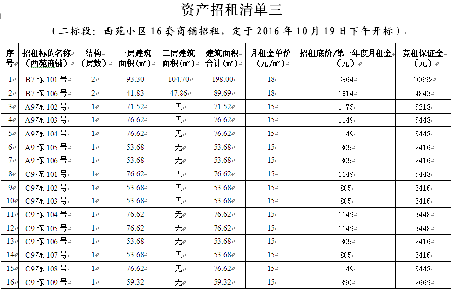 3、位于西苑小区的部分商铺(共16套,其中的2套二层、14套一层)。每套商铺资产各为一个标的。