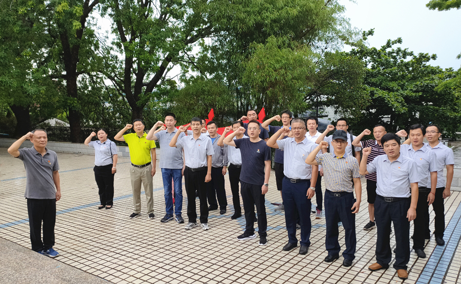 两家单位24名党员首先来到石碌矿山公园死难矿工纪念碑跟前,海南河道公司党员张燕向大家讲述了日本疯狂掠夺、开采石碌铁矿的故事。1939年2月,日本侵占海南岛,先后从上海、东莞、汕头、厦门等地用欺骗和强抓手段抓来4万多矿工。由于当时生产流程比较简单,生产运输全部靠人力完成,广大矿工深受剥削和压迫,一些英魂永远长眠于石碌铁矿这片热土。党员们被深深感动,全体肃立,向纪念碑敬献了花篮,表达对先辈的深切缅怀和崇高敬意。面向鲜红的党旗,李涛带领在场党员重温入党誓词。铮铮誓言,激昂回响,在场党员再次接受了心灵的洗礼。